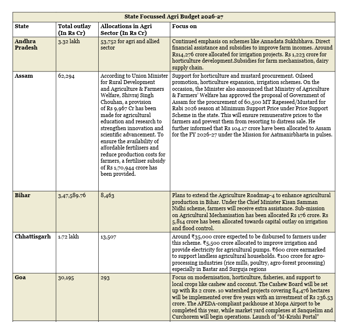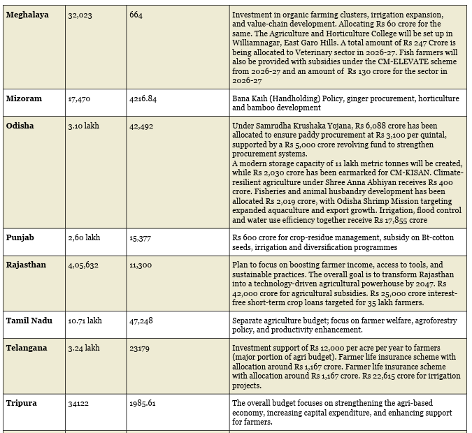 State agriculture budgets are gradually transitioning from a traditional support-oriented framework toward a transformation-focused investment model. Between FY 2026–27 and the medium-term horizon of 2031, one can see higher allocations toward infrastructure, technology integration, climate resilience, and value chain development.
