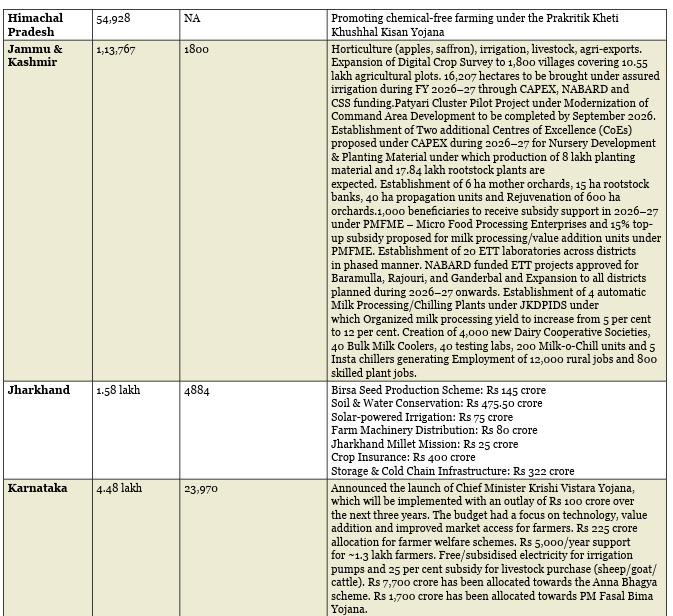 Jharkhand: For 2026-27, Govt of Jharkhand has allocated Rs 4884 crore dedicated to the agriculture and allied sector. The budget aims at enhancing the rural economy through improved irrigation (including solar-powered pumps), soil conservation, and certified seed production.