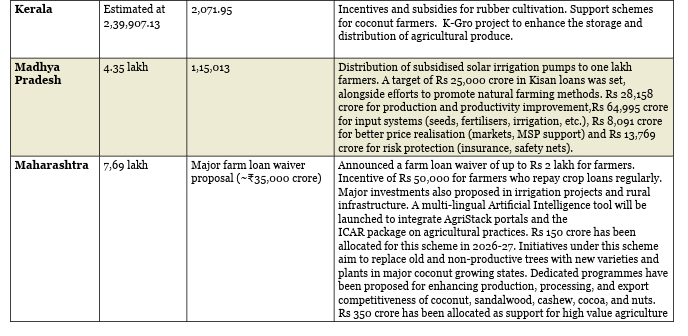 Karnataka: The state announced the launch of Chief Minister Krishi Vistara Yojana, which will be implemented with an outlay of Rs 100 crore over the next three years. The budget had a focus on technology, value addition and improved market access for farmers.
