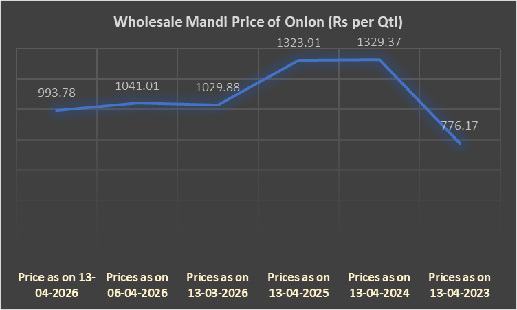 Onion prices stood at Rs 993.78 per quintal, down from Rs 1,041.01 a week ago, indicating a 4.53 percent decline, and lower than Rs 1,029.88 a month ago, reflecting a 3.50 percent drop. Compared to Rs 1,323.91 a year ago, prices are down 24.93 percent. Despite the recent moderation, onion prices remain significantly above Rs 776.17 recorded three years ago, although they are below Rs 1,329.37 levels seen two years ago, suggesting improved supply conditions following earlier price spikes.
