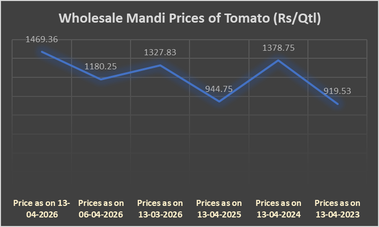 Tomato prices rose to Rs 1,469.36 per quintal as on April 13, 2026, up from Rs 1,180.25 a week ago, reflecting a 24.49 percent increase, and higher than Rs 1,327.83 a month ago, marking a 10.65 percent rise. On a year-on-year basis, prices have surged 55.52 percent compared to Rs 944.75 recorded in April 2025. Over a longer horizon, tomato prices remain above Rs 919.53 seen three years ago and are slightly higher than Rs 1,378.75 recorded two years ago, underscoring the cyclical nature of supply-driven volatility.