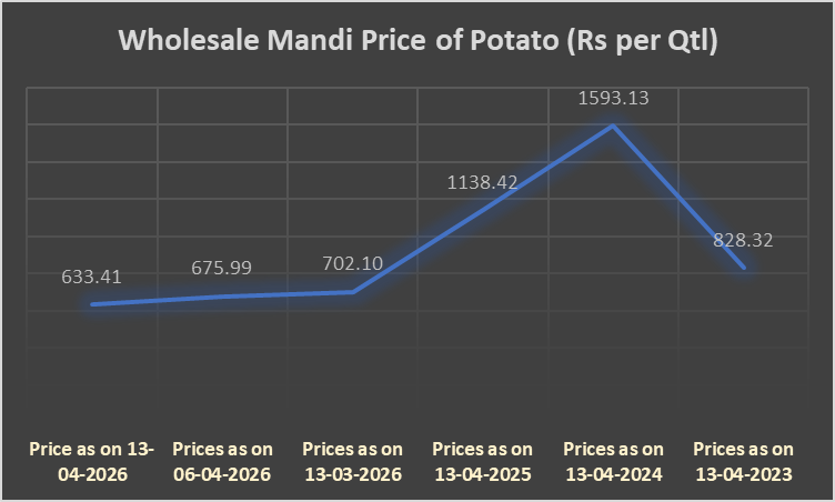 Potato prices declined further to Rs 633.41 per quintal, compared to Rs 675.99 a week ago, marking a 6.29 percent drop, and down from Rs 702.10 a month ago, reflecting a 9.78 percent decline. On a year-on-year basis, prices have fallen sharply by 44.36 percent from Rs 1,138.42 recorded in April 2025. Prices are also significantly lower than Rs 1,593.13 seen two years ago and below Rs 828.32 recorded three years ago, indicating a prolonged phase of surplus supply and sustained price correction.