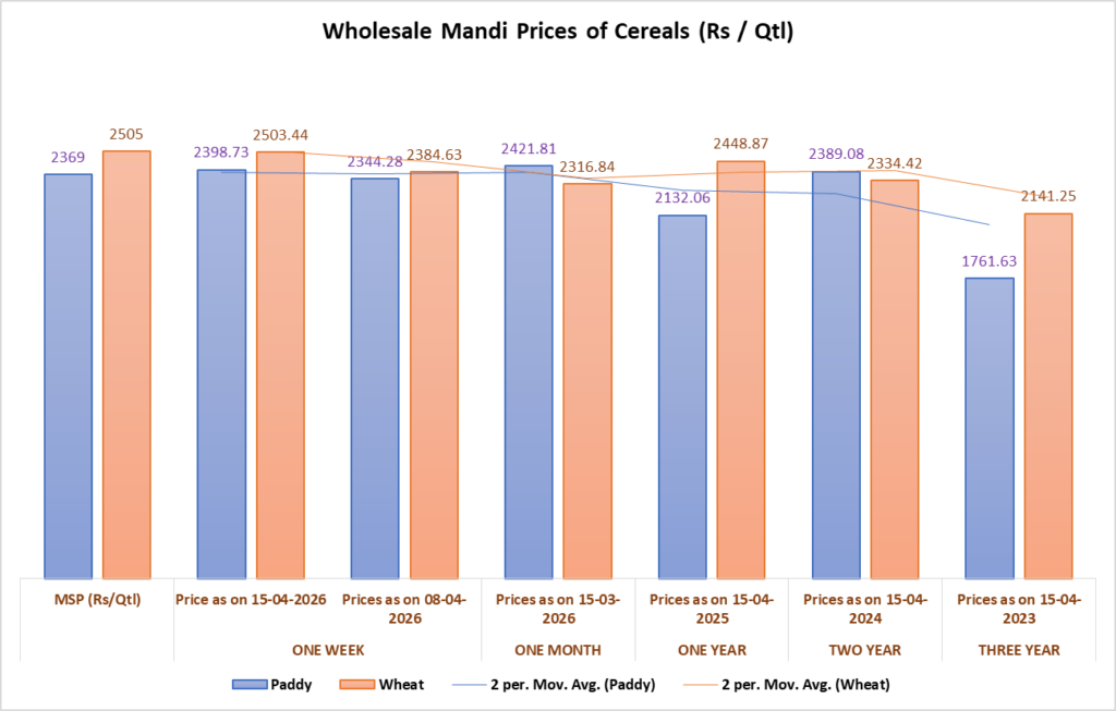 The data reflects a relatively balanced cereal market compared to more volatile segments such as pulses, with both paddy and wheat benefiting from strong procurement systems, stable demand, and policy support mechanisms. The alignment of mandi prices with MSP levels suggests effective price stabilization, ensuring minimum returns for farmers while maintaining supply availability.
