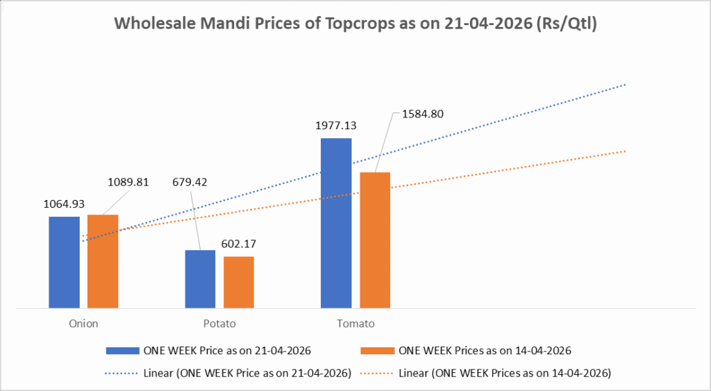 As per wholesale mandi data released by the Department of Agriculture & Farmers Welfare, tomato prices stood at Rs 1,977.13 per quintal as on April 21, 2026, registering a steep increase of 95.61 per cent year-on-year and 40.53 per cent over the past month, reflecting supply-side pressures and seasonal volatility. On a weekly basis, tomato prices rose 24.75 per cent, indicating a sharp near-term escalation.