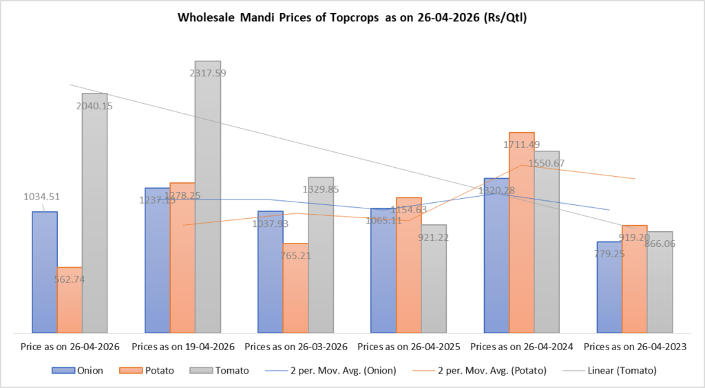 Potato prices have recorded the most significant decline among major crops, falling from Rs 1278.25 per quintal on April 19, 2026 to Rs 562.74 per quintal on April 26, 2026, marking a sharp 55.97 per cent week-on-week drop. The correction is equally pronounced across longer timeframes, with prices down from Rs 765.21 a month ago (26.45 per cent decline) and Rs 1154.63 a year ago (51.26 per cent decline). Compared to two and three years ago—when prices stood at Rs 1711.49 and Rs 919.20 respectively—potatoes are down 67.11 per cent and 38.77 per cent, highlighting a sustained downcycle driven by ample supply and improved arrivals.
